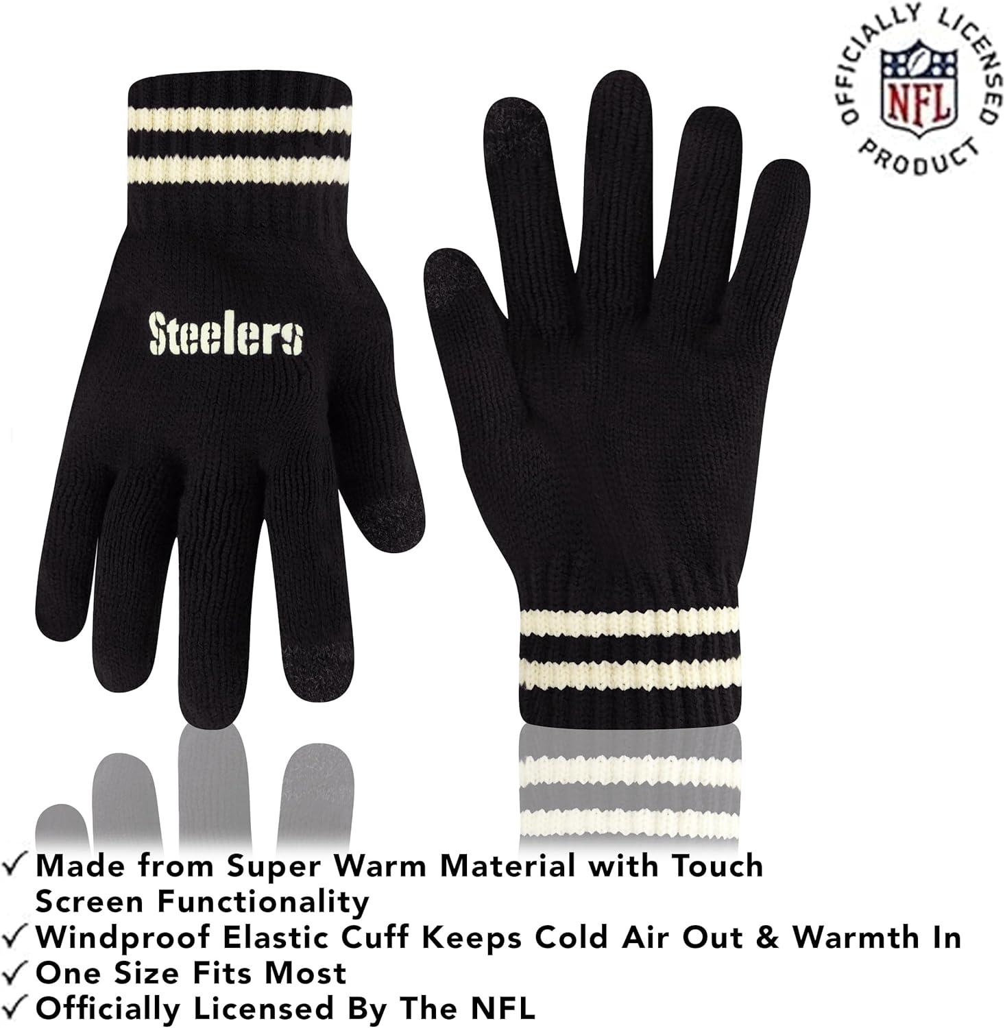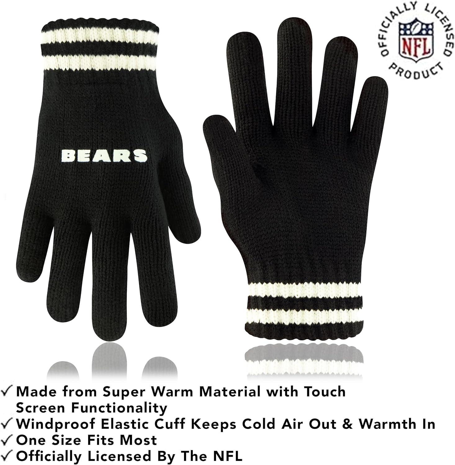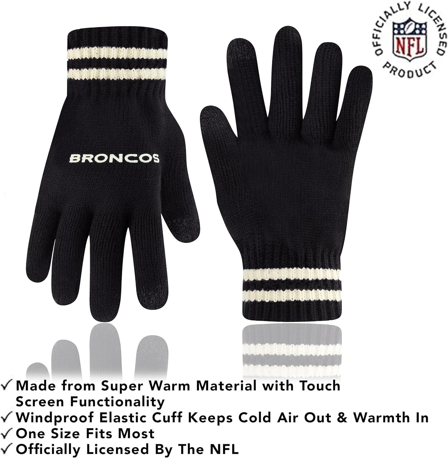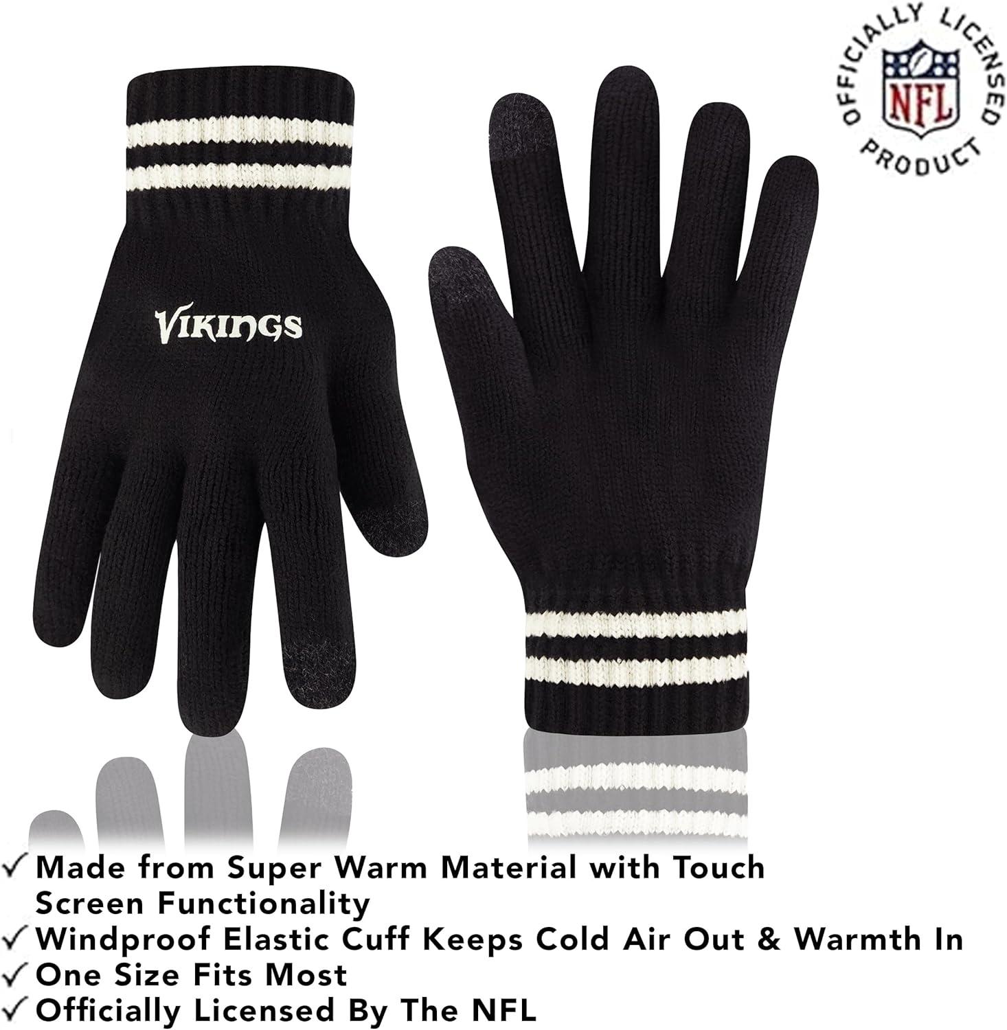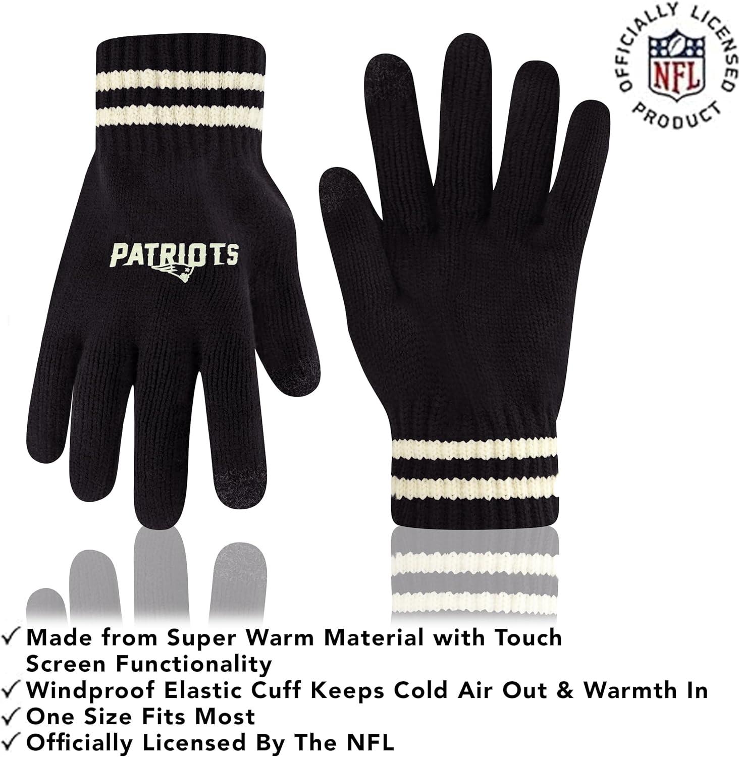 NFL COLLECTION: Officially Licensed By The NFL, Ultra Game NFL revives classic fan gear with innovative designs and fabric updates, appealing to all. SUPERIOR WARMTH: Soft material in your team's core colors keeps you warm, with an elastic cuff on gloves to keep snow and wind out. TOUCH-SCREEN FRIENDLY: Thumb and first finger on both gloves allow device use without removal. ADJUSTABLE FIT: Stretchy beanie fits most, staying secure and comfortable. STYLE AND DESIGN: High-quality graphics of your favorite NFL team in official colors adorn the hat and gloves.