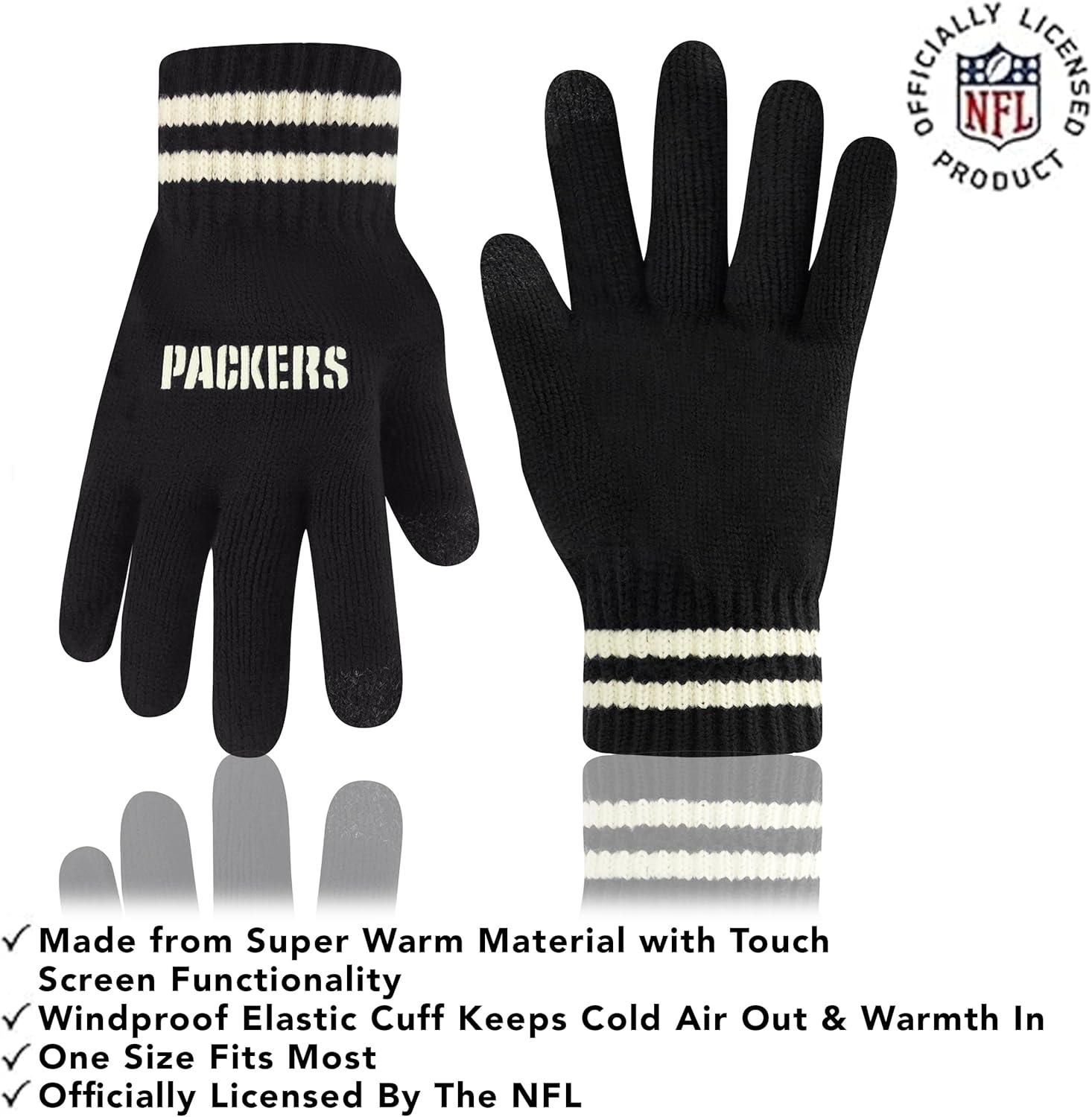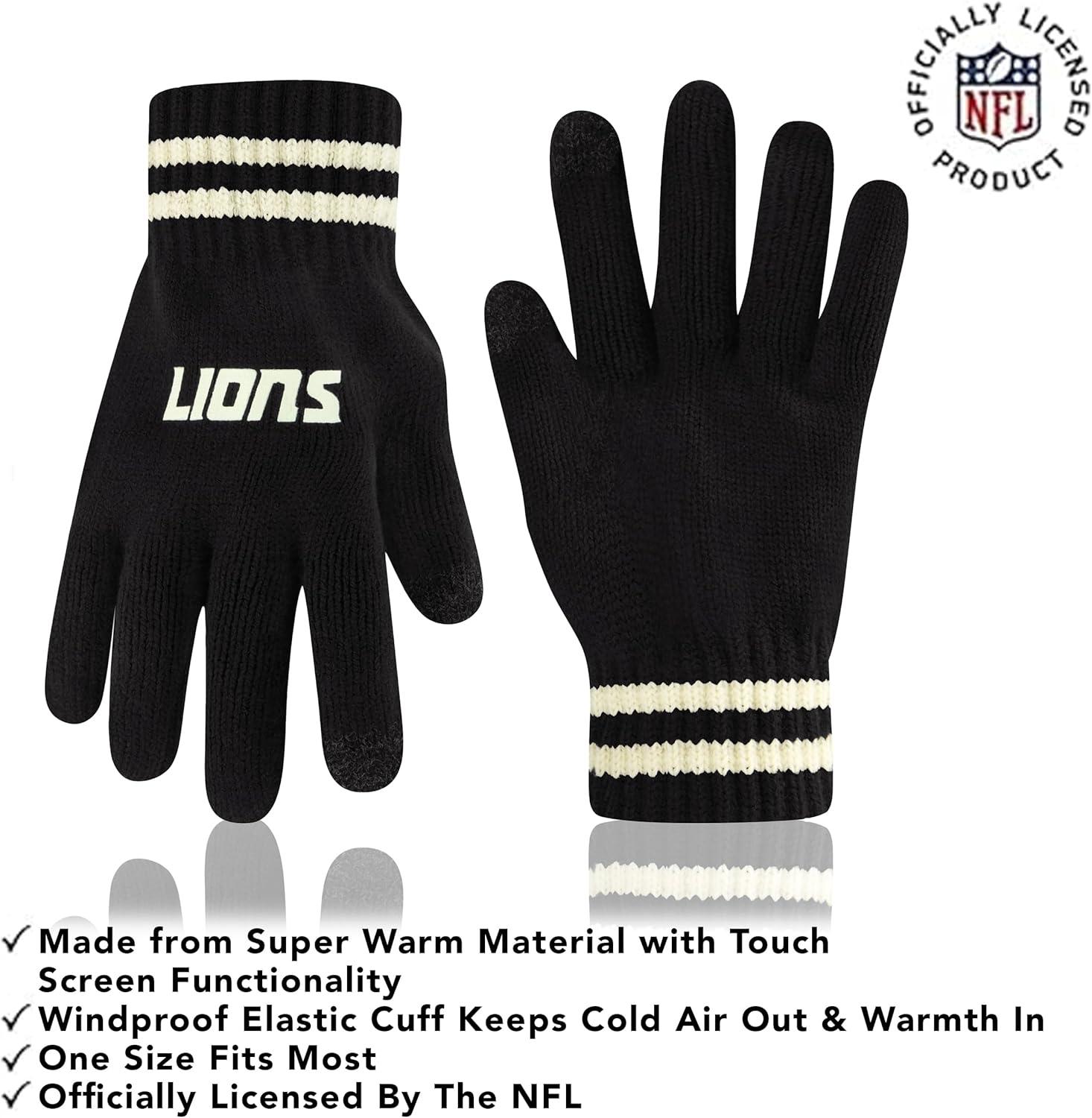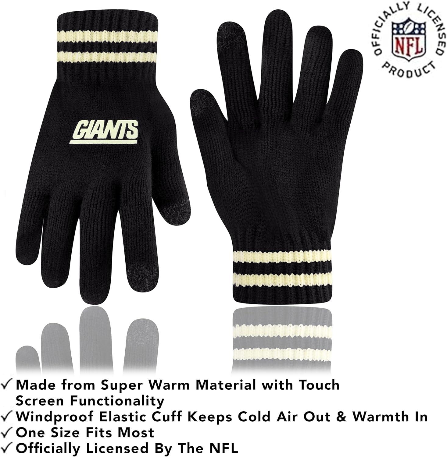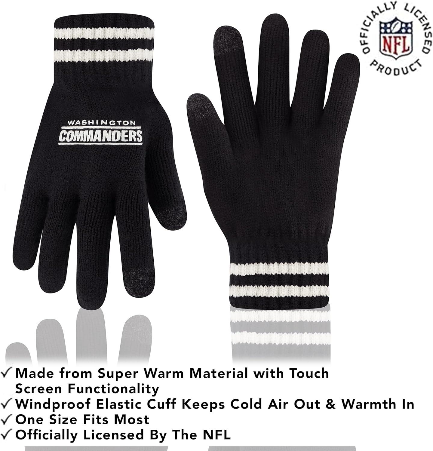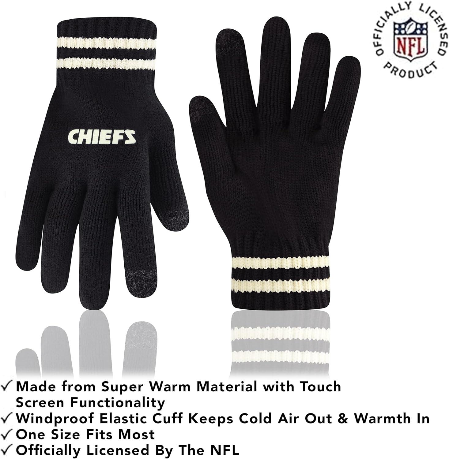 NFL COLLECTION: Officially Licensed By The NFL, Ultra Game NFL revives classic fan gear with innovative designs and fabric updates, appealing to all. SUPERIOR WARMTH: Soft material in your team's core colors keeps you warm, with an elastic cuff on gloves to keep snow and wind out. TOUCH-SCREEN FRIENDLY: Thumb and first finger on both gloves allow device use without removal. ADJUSTABLE FIT: Stretchy beanie fits most, staying secure and comfortable. STYLE AND DESIGN: High-quality graphics of your favorite NFL team in official colors adorn the hat and gloves.