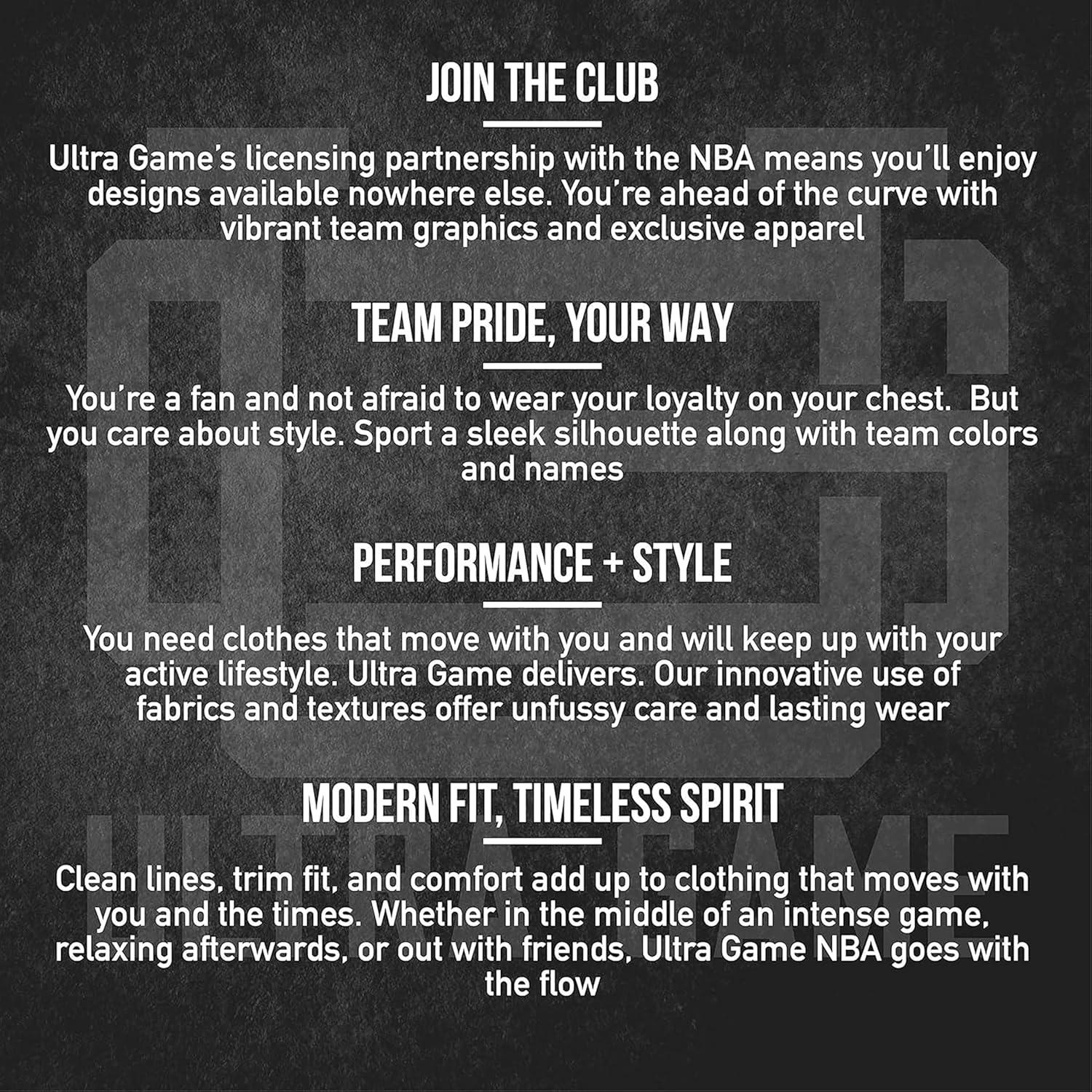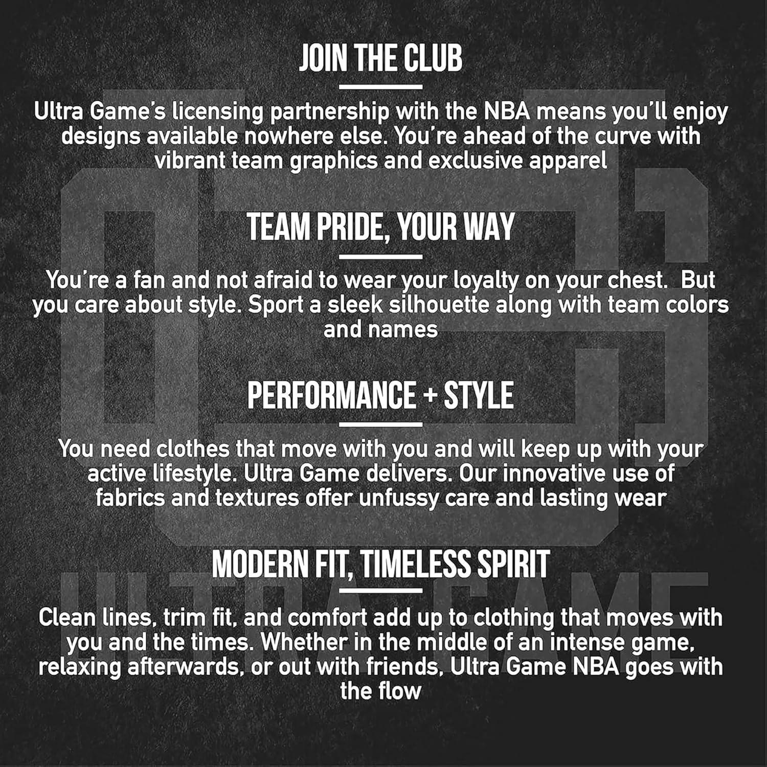 Ultra-Game partners with the major sports leagues and franchises to bring you officially licensed gear at down-to-earth prices. If you like to wear your passion in public, Ultra Game's got you covered. Whether it's streetwear, loungewear, or true workout gear, Ultra Game is your number one source for highly fashionable team apparel. Why buy Ultra Game brand products? 100% Authentic – Ultra Game manufactures officially licensed apparel for the NBA and NFL. Best In Class Apparel – We focus on manufacturing the highest quality apparel at affordable prices. Highly Fashionable – We are constantly updating our styles with the latest fashion trends. Satisfaction Guaranteed – We will work with you to resolve all issues until you are completely satisfied.