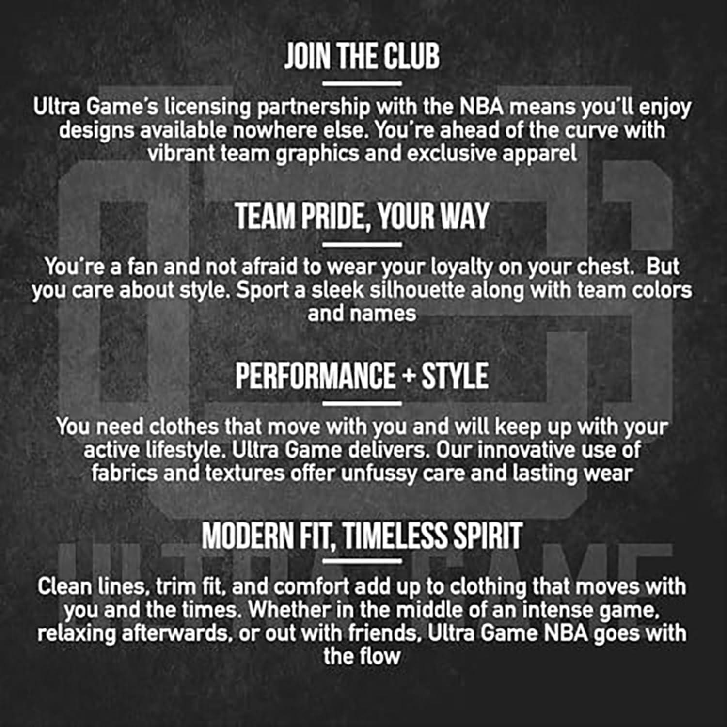 Ultra Game partners with the major sports leagues and franchises to bring you officially licensed gear at down-to-earth prices. If you like to wear your passion in public, Ultra Game's got you covered. Whether it's streetwear, loungewear, or true workout gear, Ultra Game is your number one source for highly fashionable team apparel. Why buy Ultra Game brand products? 100% Authentic – Ultra Game manufactures officially licensed apparel for the NBA and NFL. Best In Class Apparel – We focus on manufacturing the highest quality apparel at affordable prices. Highly Fashionable – We are constantly updating our styles with the latest fashion trends. Satisfaction Guaranteed – We will work with you to resolve all issues until you are completely satisfied.