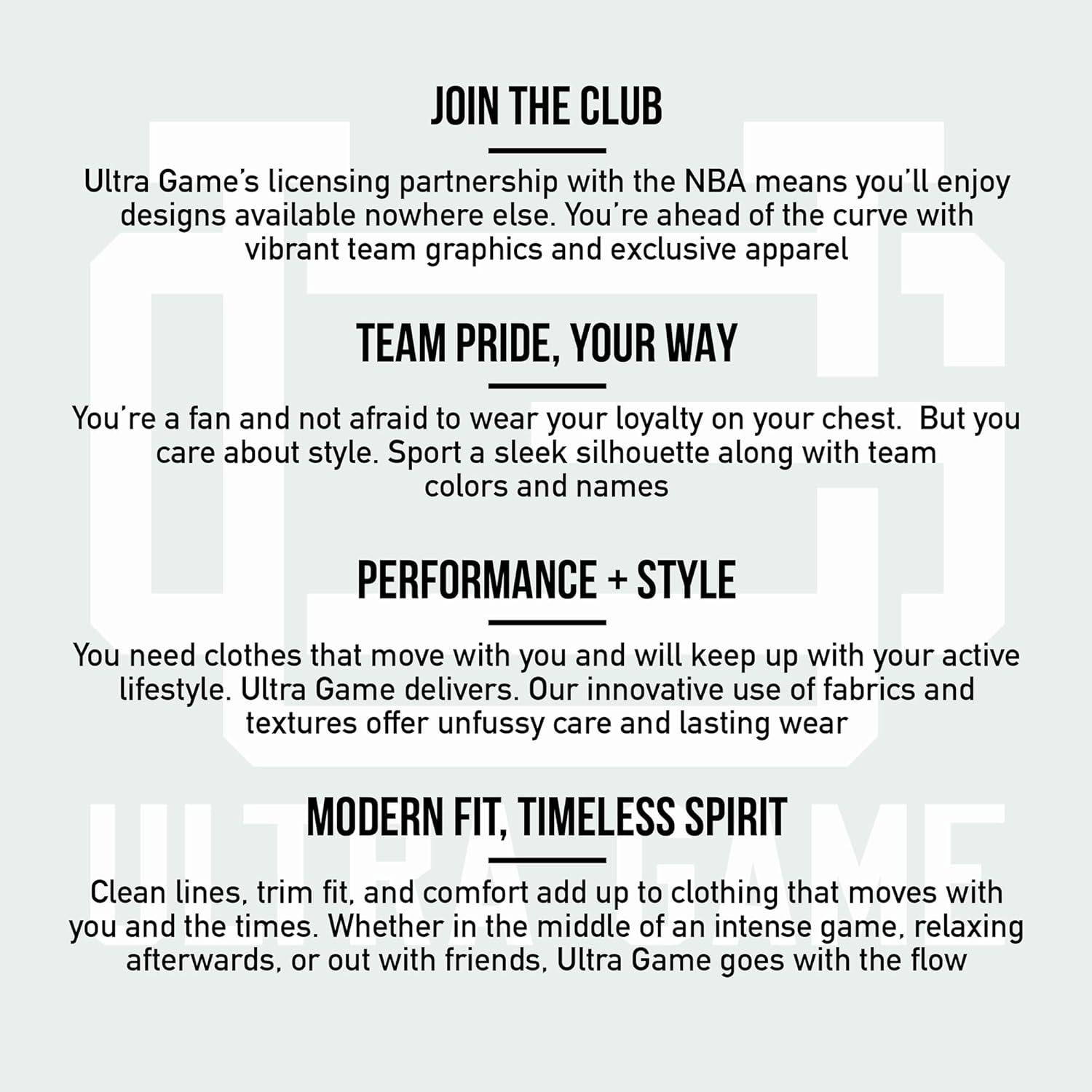 Ultra-Game partners with the major sports leagues and franchises to bring you officially licensed gear at down-to-earth prices. If you like to wear your passion in public, Ultra Game's got you covered. Whether it's streetwear, loungewear, or true workout gear, Ultra Game is your number one source for highly fashionable team apparel. Why buy Ultra Game brand products? 100% Authentic – Ultra Game manufactures officially licensed apparel for the NBA and NFL. Best In Class Apparel – We focus on manufacturing the highest quality apparel at affordable prices. Highly Fashionable – We are constantly updating our styles with the latest fashion trends. Satisfaction Guaranteed – We will work with you to resolve all issues until you are completely satisfied.
